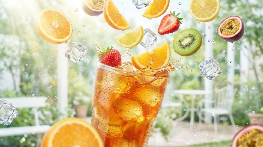 充滿動感的水果茶廣告圖片!展現了新鮮水果切片、冰塊、茶飲在空中飛舞的瞬間,搭配水珠,營造出冰涼、清爽、多汁的視覺效果,完美呈現水果茶的清新魅力。