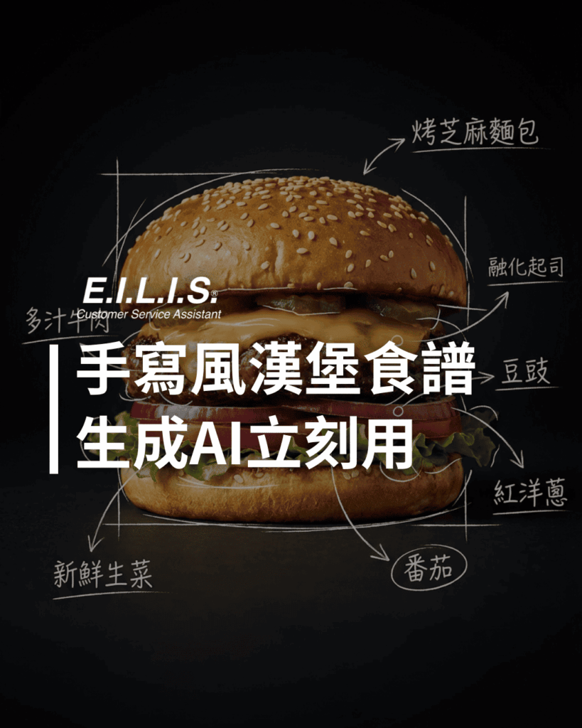 text size is medium to large and clearly readable, labels explaining each ingredient and its role (e.g. 多汁牛肉、融化起司、新鮮生菜),