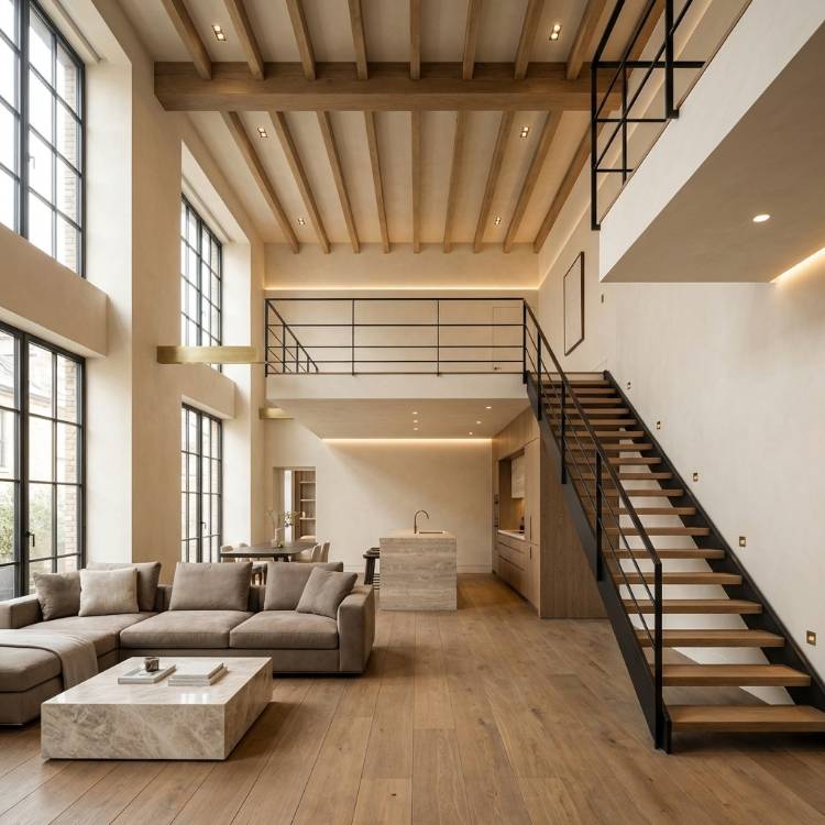 [Overall Visual Style] Photorealistic architectural interior photography. Originally Scandinavian-industrial, minimal and warm. However, refinement level is moderate — more lifestyle casual than high-end. To reach “精緻” level, detailing must feel curated, custom-designed, architectural, and magazine-quality. [Architecture / Space Type] Double-height foreign-style loft with mezzanine and visible staircase. Open-plan ground floor with living area and kitchen below upper platform. Strong vertical emphasis. To elevate sophistication, staircase should feel sculptural and custom, not utilitarian. [Composition & Camera] Ultra-wide architectural framing from further back, slightly low angle to emphasize height and staircase. Full two-floor composition visible. Balanced and intentional editorial framing. [Lighting & Time Feel] Soft but sculpted natural daylight from large industrial windows. Layered lighting: recessed ceiling lights, concealed LED strips, designer pendants. Light should add dimension and highlight material richness. [Color System] Refined neutral palette. Warm ivory walls, richer oak tones, elegant taupe/stone upholstery, matte black and brushed brass accents. Controlled contrast and tonal harmony. [Materials & Surface Quality] Premium wide-plank oak flooring or herringbone pattern Warm plaster or microcement walls Custom built-in cabinetry with seamless finish Black steel + wood sculptural staircase Stone or quartz kitchen island Textured fabric and leather upholstery High-end, tactile, matte and satin finishes with realistic depth. [Mood & Atmosphere] Sophisticated, curated, architectural luxury loft. International design-magazine quality. Spacious yet warm. High-end European or New York refined loft ambiance. There should be a small white logo in the bottom right corner:[2025 @ EILIS AI @ Prompts Hub] A highly refined luxury foreign-style loft interior with dramatic double-height ceiling and a sculptural staircase leading to a mezzanine second floor, ultra-wide architectural lens placed further back to capture the full vertical volume in one balanced composition, slightly low eye-level perspective emphasizing height and elegance, custom-designed open-riser staircase in black steel and warm oak clearly visible as a focal architectural element, spacious open-plan living area with tailored taupe sectional sofa, designer marble or stone coffee table, premium wide-plank oak flooring in warm tone, warm ivory plaster walls, custom seamless built-in cabinetry, stone kitchen island beneath the mezzanine, brushed brass accents, slim black steel railings, integrated recessed lighting and concealed LED strips creating layered illumination, large industrial-style floor-to-ceiling windows bringing in soft sculpted natural daylight, cohesive refined neutral palette of warm ivory, rich oak, stone beige, matte black and subtle brass details, deep depth of field with sharp architectural clarity from floor to ceiling, editorial design magazine quality, ultra-realistic materials and textures, sophisticated curated atmosphere, no people, no clutter, no text, no blur Aspect ratio: 1:1