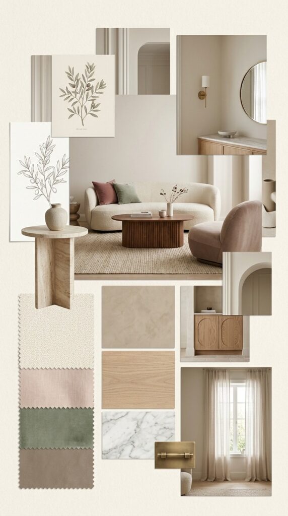 [Overall Visual Style] A refined editorial interior mood board with a luxury design-studio aesthetic. The visual language blends interior photography, material collage, product cutouts, and muted graphic layout into a clean, curated composition. The style feels minimal, restrained, elegant, soft, and highly polished rather than dramatic or loud. [Architecture / Space Type] The image represents an interior design concept board rather than a single built space. The referenced spaces suggest upscale residential interiors with boutique-hotel refinement: lounge seating areas, corridor details, wall treatments, and decorative objects. The massing emphasis is vertical in layout, with stacked collage elements arranged in a tall editorial board format.There should be a small white logo in the bottom right corner:[2026 @ EILIS AI @ Prompts Hub] [Composition & Camera] The composition is a layered flat mood board: multiple rectangular image blocks, cropped furniture, botanical elements, color swatches, and texture panels arranged asymmetrically on a neutral background. The interior photos themselves are shot frontally or with a gentle perspective, using a standard-to-slightly-wide lens feel. Depth of field appears mostly controlled and clean, with crisp subject separation but not exaggerated blur. [Lighting & Time Feel] Lighting is soft, diffused, and calm, with a daylight-studio feel. Shadows are subtle, contrast is low to medium, and the overall impression is bright but muted. The atmosphere suggests late morning or controlled natural interior light, with no harsh sunlight. [Color System] The palette is disciplined and tonal. Dominant colors include warm ivory, beige, sand, taupe, natural oak, muted brown, sage, and deep emerald green. Saturation is low to moderate, with an earthy, upscale warmth. Color blocking is intentional and sparse, giving the board a sophisticated, feminine restraint. [Materials & Surface Quality] Key materials include matte plaster, natural wood slats or light oak veneer, brushed or muted metal accents, velvet upholstery, stone or microcement surfaces, and translucent botanical textures. Surface quality appears smooth, tactile, realistic, and premium, with a soft matte finish rather than glossy shine. [Mood & Atmosphere] Calm, feminine, elegant, modern, curated, soft luxury, quiet confidence, understated sophistication, editorial, serene. A high-end interior design mood board for a modern feminine residential interior, presented as a refined editorial collage on a soft warm ivory background, featuring layered cutouts of a stylish living space with curved seating, elegant lounge chairs, a sculptural ottoman, soft botanical sketches, material swatches, muted texture panels, and cropped architectural details; the design language should feel sophisticated, minimal, and quietly luxurious, with a balanced composition of overlapping rectangles and asymmetrical spacing, inspired by luxury interior magazine layouts and professional design studio presentation boards; include a calm palette of warm beige, ivory, taupe, soft sand, light oak, blush-tinted neutrals, muted sage, and one deeper accent tone such as dusty rose or forest green; emphasize matte plaster walls, natural wood, soft velvet or boucle upholstery, stone textures, and delicate feminine styling without becoming overly romantic or decorative; soft diffused daylight, low-to-medium contrast, realistic material rendering, elegant editorial composition, clean premium aesthetic, ultra-detailed, realistic, tasteful, serene, no distortion, no blur Aspect ratio: 9:16