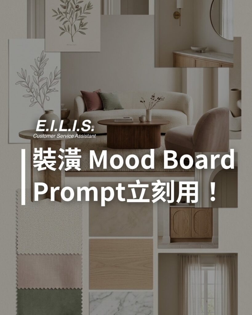 這是一種偏高級編輯感的室內 mood board 風格,把空間照片、家具、材質、植物線稿與色票拼貼在同一張版面上!